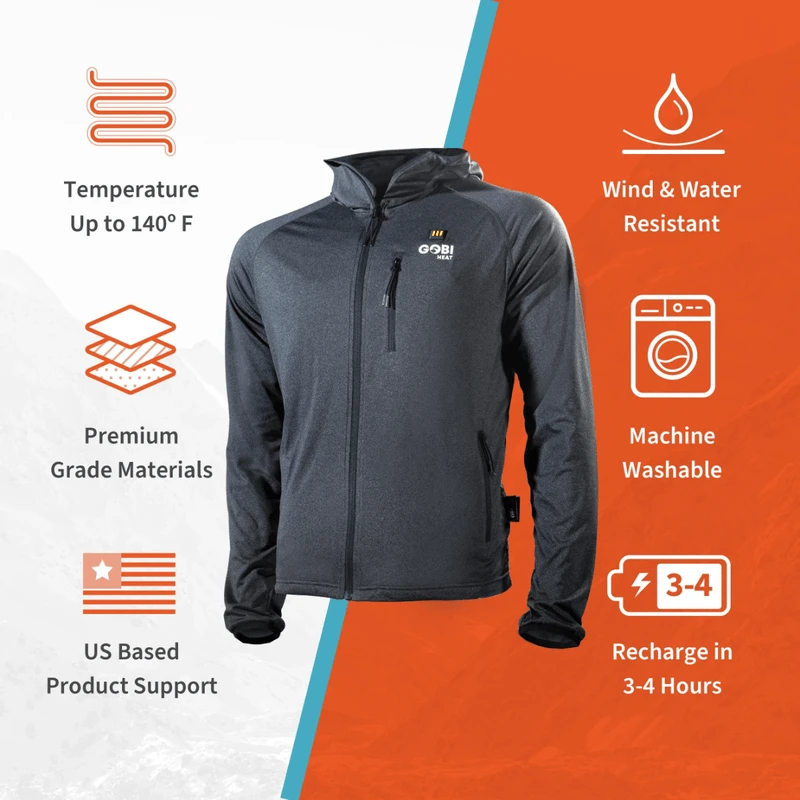The Ridge heated hoodie combines the perfect mix of comfort, style and warmth. Take back control of your life with conductive thread heating technology. With two zones in the front and a large zone in the back and up to 10 hours of heat, be ready for anything. With heat zones in the chest and back, you are heating up your core muscles increasing circulation, keeping yourself warm even in the harshest conditions. Three distinct heat settings: Low, Medium, and High, you are able to customize your experience to match any situation you’re in. Included is Gobi’s 6500 milliamp hour Lithium Polymer battery that will last you up to 10 hours on low, 8 hours on medium, and 6 hours on high.
