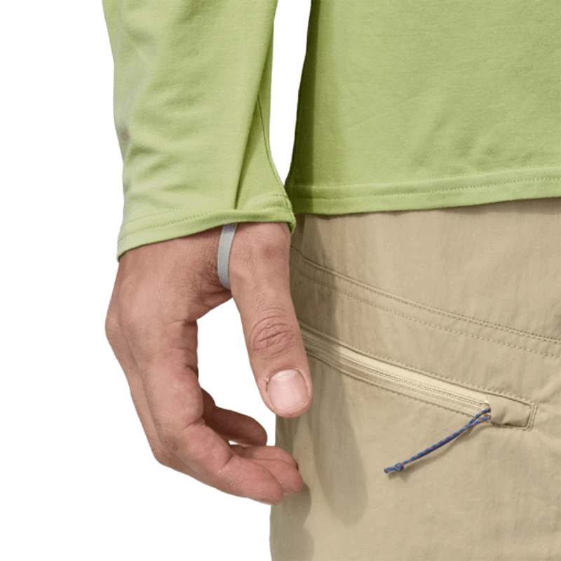 - Longer sleeve length with thumb-hole elastic at cuffs provides added sun protection on the backs of hands