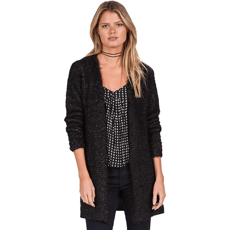 Volcom Women’s Faded Rays Sweater in Black. Open front sweater with dropped shoulder and long body length. Metal label at bottom hem.